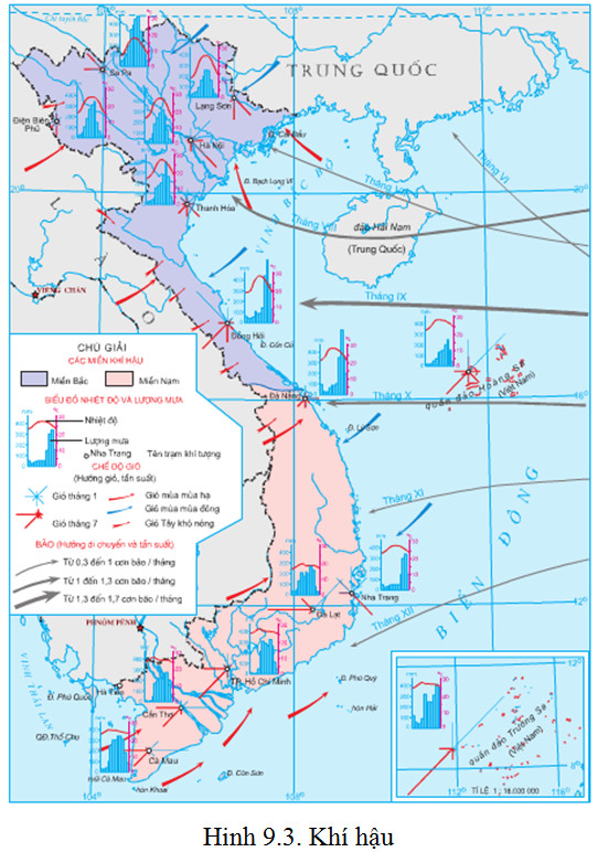 Trong chế độ khí hậu, ở miền Bắc có sự phân chia thành mùa đông lạnh, ít mưa và mùa hạ nóng ẩm, mưa nhiều. Còn ở miền Nam có hai mùa: mùa khô và mùa mưa rõ rệt.